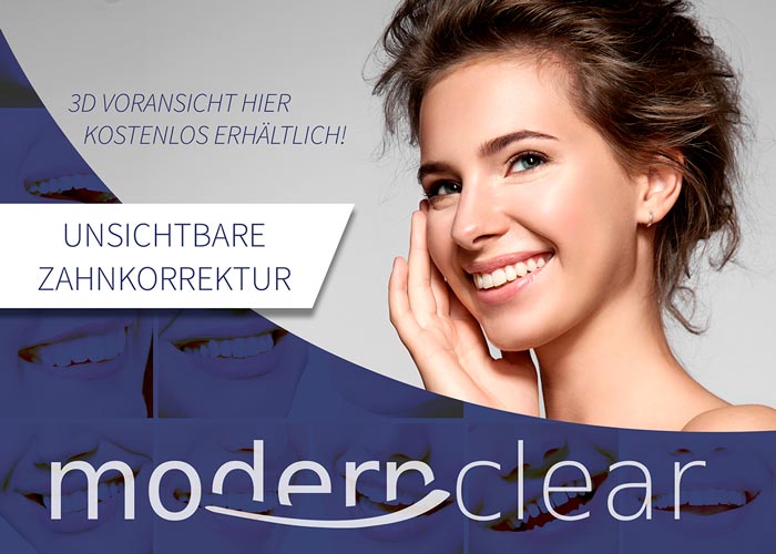 Unsere Praxis bietet Ihnen die nahezu unsichtbare Korrektur von Zahnfehlstellungen mit transparenten Schienen des deutschen Qualitäts-Anbieters MODERN CLEAR an.