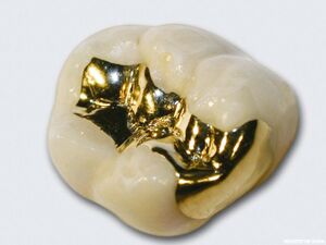 Goldinlay – Goldgussfüllungen haben sich seit Jahrzehnten als eine qualitativ sehr hochwertige Restaurationsform bewährt, werden aber heute aus ästhetischen Gründen nicht mehr verlangt.