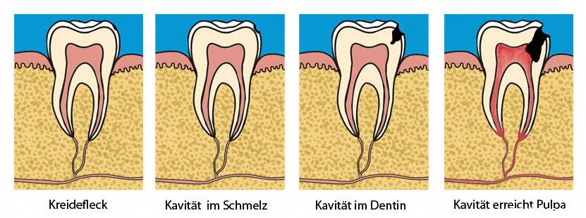 Wenn ein Kreidefleck nicht remineralisiert wird, kann sich daraus eine kleine Kavität im Schmelz entwickeln. Dieses Stadium verursacht üblicherweise noch keine Schmerzen. Erst wenn die Karies ins Dentin fortschreitet, kommt es in der Regel zu Zahnschmerzen. In diesem Stadium kann die Zahnpulpa noch vital erhalten werden. Falls die Karies die Pulpa jedoch erreicht, werden die Zahnschmerzen stärker und es muss unter Umständen eine Wurzelkanalbehandlung durchgeführt werden.