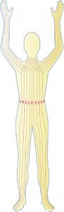 Innere Organe, Nerven, Blutgefäße, Muskeln und Haut innerhalb eines Segments stehen in besonders enger Beziehung und bilden eine Funktionseinheit. Der Körper wird von den Energiebahnen in 10 Längssegmente und 31 Quersegmente, die den Versorgungsgebieten der Rückenmarksnerven entsprechen, geteilt.